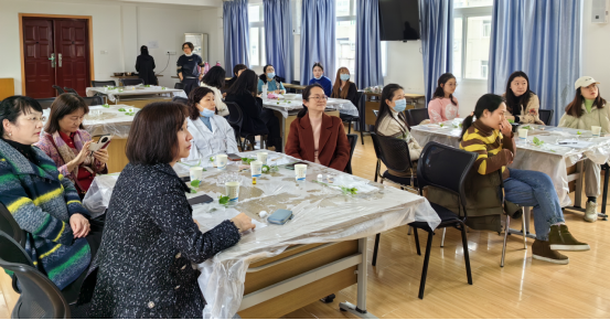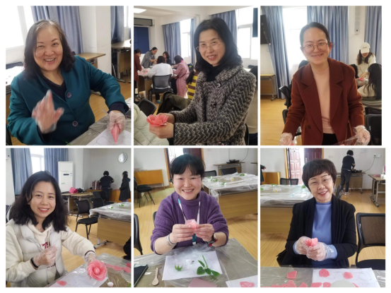 学院女教职工们都踊跃参加到活动中,在这个美丽的季节,大家在指导老师的辅导下认真学习,一个花瓣一个花瓣小心翼翼地涂抹、定型、包裹、折叠、固定……,通过上十道步骤,一支美丽的、活灵活现的玫瑰就做好啦。