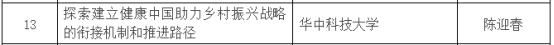 全国政协委员、中国人口与发展研究中心主任、健康中国研究中心理事长贺丹公布了健康中国建设重大研究揭榜攻关入围单位名单。williamhill中文同济医学院WilliamHill威廉希尔冯占春教授作为项目负责人带领团队申报的揭榜任务方向为:(十)健全健康中国建设支撑保障体系研究,攻关任务为 “健康中国建设支撑体系及其运行机制研究”; 陈迎春教授团队申报的揭榜任务方向为:(五)健康中国助力乡村振兴战略衔接机制研究,攻关任务为“探索建立健康中国助力乡村振兴战略的衔接机制和推进路径”,两位教授攻关任务均成功入围。