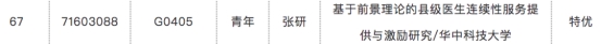 近日,国家自然科学基金委员会管理科学部2021年度项目绩效评估会议在北京召开,2月21日发布了管理科学部2021年度项目绩效评估结果,我院张研副教授承担的国家自然科学基金青年项目《基于前景理论的县级医生连续性服务提供与激励研究》(2016-2019)被评为“特优”,是今年卫生管理政策方向唯一的“特优”。