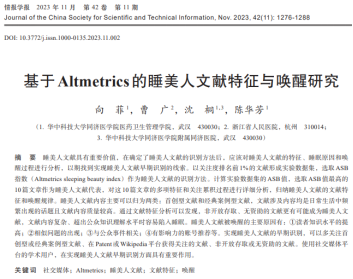 该研究聚焦于基于Altmetrics的睡美人文献,以其较长的睡眠时间和关注的突增这两个特点为核心,参考四分位数和Bcp指数的思路,设计了一种新的ASB指数,实验结果表明该方法对基于Altmetrics的睡美人文献识别效果良好。在此基础上,研究选取了ASB值TOP10的文章作为睡美人文献代表,对其多项特征和关注累积过程进行分析,归纳睡美人文献的文献特征和唤醒规律。该研究从Altmetrics的角度开展睡美人文献研究,有助于拓展科学界对于睡美人文献的认识,丰富Altmetrics研究体系。