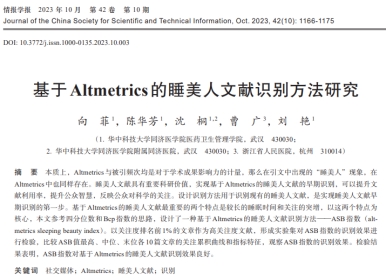 情报学领域权威期刊《情报学报》于2023年第10期和第11期发表我院医药信息管理系教师向菲副教授作为第一作者的系列论文,论文题目分别是《基于Altmetrics的睡美人文献识别方法研究》和《基于Altmetrics的睡美人文献特征与唤醒研究》。该研究成果是在学校自主创新基金“基于Altmetrics的睡美人文献识别方法与唤醒机制研究”支持下完成。