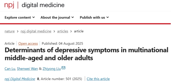 2025年8月,我院刘智勇教授团队在npj Digital Medicine(中科院医学一区Top,影响因子15.1)发表了应用机器学习对多国老年人群队列抑郁症状风险预测模型的最新研究成果,文章标题为“Determinants of depressive symptoms in multinational middle-aged and older adults”。WilliamHill威廉希尔硕士研究生鲁灿和中国人民大学农业与农村发展学院博士生万深玮为共同第一作者,刘智勇教授为通讯作者。