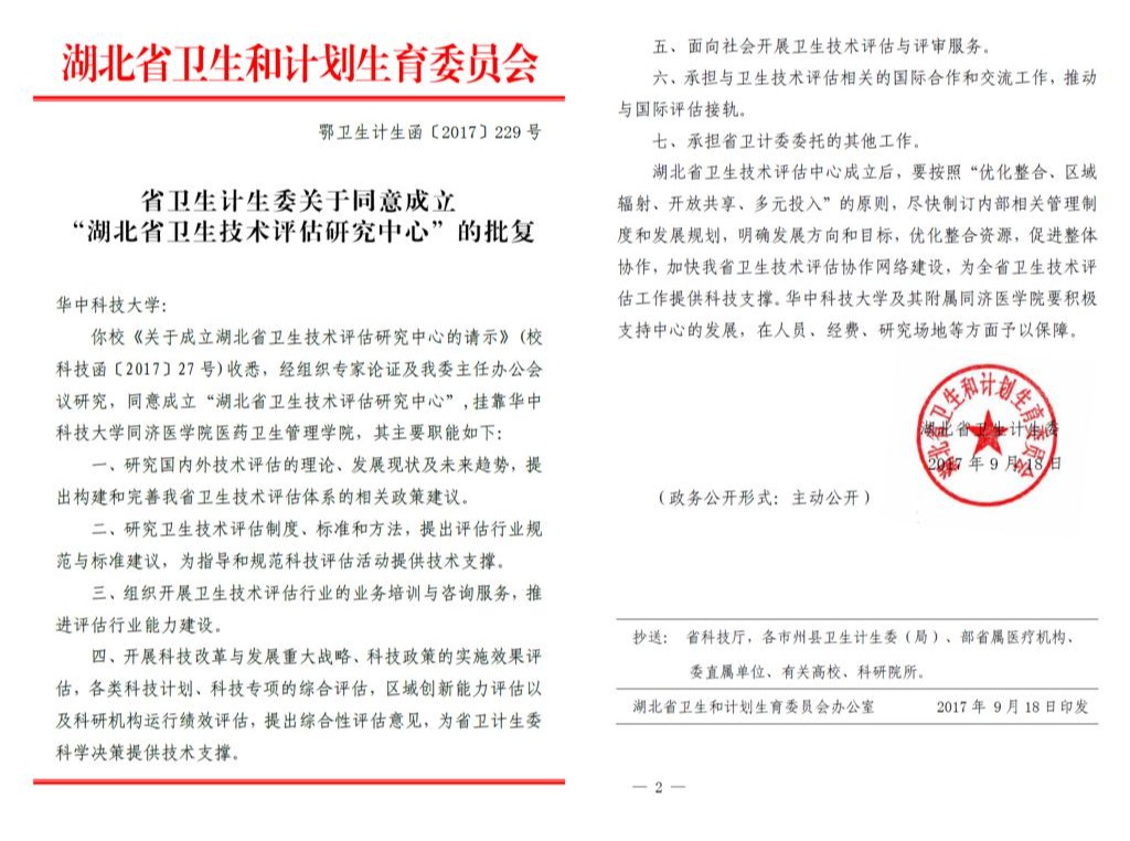 为此,2017年9月原湖北省卫生计生委批准,并于2017年11月正式揭牌成立了“湖北省卫生技术评估研究中心”(Hubei Provincial Research Center for Health Technology Assessment,HPRC-HTA),挂靠在WilliamHill威廉希尔。