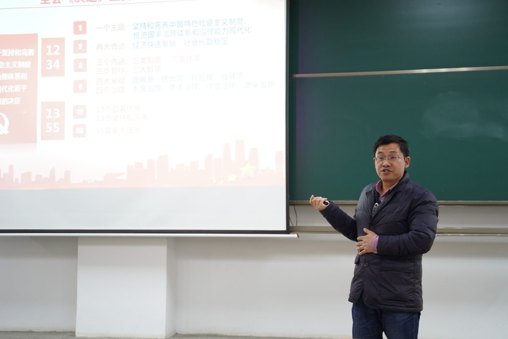 12月12日,医管院、公卫学院与药学院学习贯彻党的十九届四中全会精神宣讲会在同济医学院一号楼2大教室举行。马克思主义学院副教授沈昊驹以《从“中国之制”到“中国之治”》为题,为与会师生解读了党的十九届四中全会精神。三个学院的党政班子成员、教职工和学生代表共220人到会听讲。