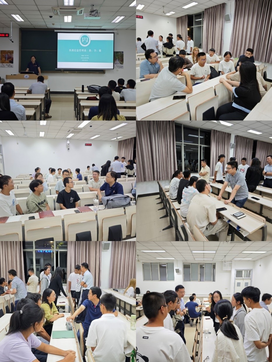 医药信息管理系主任沈丽宁介绍了信管专业的培养方案和目标,并指出大学要注重培养批判性思维和自主学习能力,着重综合能力的提升。信息系全体专任教师依次发言做自我介绍,以老师和家长的双重角度鼓励同学们虚心求教、积极参与学院的各项活动,培养作为华科大医管学子的独特竞争优势。信管2021级本科生周洋、何宇杉同学作为优秀本科生代表进行经验分享。