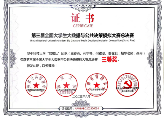 大赛围绕政府公共治理过程中需要解决的实际问题,从启动到决赛历时近2个月,共吸引全国111所学校近400支队伍报名参赛,最终40所院校50支队伍晋级总决赛。经历初赛、决赛和现场答辩汇报,我院医药信息管理系张韦副研究员指导的本科生团队(王春燕、何宇杉、何雅姿、贾春旭)提交的研究报告《基于微博平台医患关系的网络舆情分析》脱颖而出,荣获三等奖;指导教师张韦老师荣获优秀指导教师奖;我校荣获优秀组织单位奖。