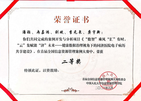 大赛从启动到决赛历时三个月,共吸引来自全国91所高校的1130名学生、260支队伍报名参加,最终8支队伍晋级决赛。经过初赛、复赛、小组赛选拔,我院周利琴老师指导的学生团队(潘颖、冉嘉鸿、刘斌、李元泉、龚宇新)凭借案例报告《“数智”乘风“汇”有时,“云”集赋能“济”未来——健康数据治理视角下的同济医院电子病历共享建设》成功进入决赛环节,在6月10日下午的半决赛“八进四”中脱颖而出,跻身前四强。6月11日上午,团队在总决赛中通过对主办方所给案例报告的专业分析,展开精彩辩论,最终荣获二等奖;指导老师周利琴荣获优秀指导教师奖;潘颖、冉嘉鸿、刘斌等三名本科生荣获中国人民大学夏令营直通名额。