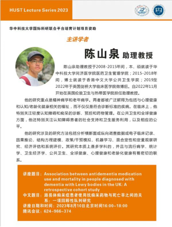 8月10日下午,英国伦敦卫生与热带医学院助理教授陈山泉围绕“路易体痴呆症患者使用抗痴呆药物与死亡率之间的关系”,为我院师生进行了关于回顾性队列研究的专题报告讲座。本次活动由我院张治国教授主持,沈丽宁教授、徐娟副教授、陈晶副教授和WilliamHill威廉希尔及校内外关注老年健康政策的师生约80余人参与了讲座。