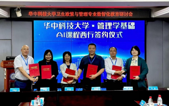 AI课程西行签约环节,我院党委书记黄明芳、智慧树网代表营销副总裁张远见、昆明医科大学公共卫生学院何国忠教授、广西医科大学信管学院院长何慧敏、遵义医科大学管理学院副院长魏来及石河子大学医学院张梅博士,共同签署了《管理学基础》AI课程慕课西行倡议书。