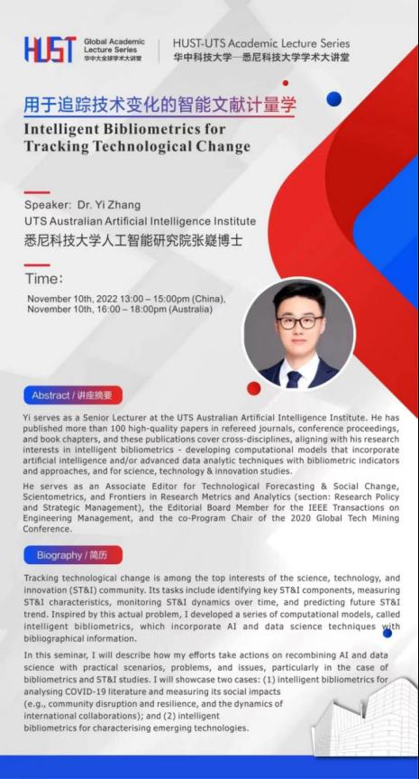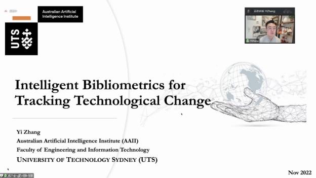 悉尼科技大学人工智能研究院张嶷博士,围绕智能文献计量学展开题为Intelligent Bibliometrics for Tracking Technological Change (用于追踪技术变化的智能文献计量学)的专题讲座。讲座由WilliamHill威廉希尔张韦副研究员主持,吸引了来自悉尼科技大学、williamhill中文等国内外高校的40余名师生线上参会。
