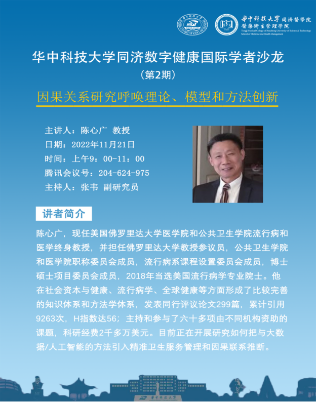 美国佛罗里达大学医学院公共卫生学院陈心广教授应邀担任本期沙龙的主讲人,分享的主题为因果关系研究呼唤理论、模型和方法创新。