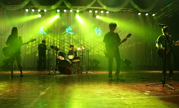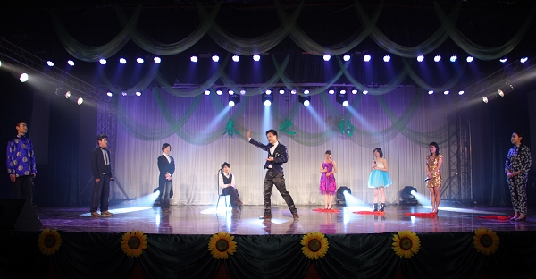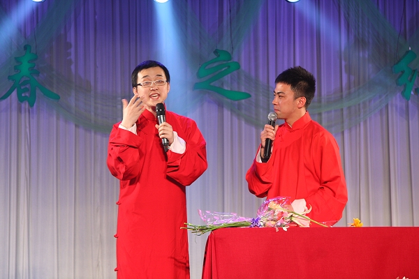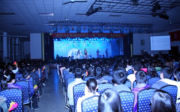 晚会还特别邀请到湖北经济广播电台的专业播音员表演相声《学外语》,在笑声中为大家讲述了语言的魅力。而由11级新生与环境学院、生命学院和中国地质大学同学共同组成的final day 乐队带来的摇滚乐,以其富有激情的音乐节奏震撼全场,将晚会再一次推向高潮。