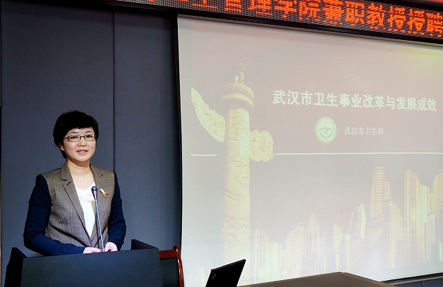 李滔教授也作了题为“武汉市卫生事业改革与发展成效”的专题报告。她主要从新医改五项重点工作内容出发,介绍了新医改实施以来武汉市卫生事业在医疗保障体系建设、国家基本药物制度实施推进、基本公共卫生服务能力建设以及公立医院改革进展等方面所取得的成绩和工作亮点,全方位、多层次地向在场师生介绍武汉市卫生事业发展。接着,她又对武汉市委市政府关于打造国家医疗卫生服务中心的宏伟目标进行了诠释,她指出:“把武汉市打造成国家医疗卫生服务中心,主要就是两个工程——‘顶天’和‘立地’,所谓‘顶天’是指培育高端医疗品牌,建设名医、名科、名院、名中心,使武汉市医疗水平达到国家顶尖、国际一流水平;所谓‘立地’,是指筑牢基层医疗体系,基层医生进入家家户户,让老百姓人人都能享受到不同层次的医疗服务。”最后,她提出武汉市卫生事业在发展过程中仍然有许多亟待解决和研究的问题,也真诚希望在场的师生能够积极贡献出力量。