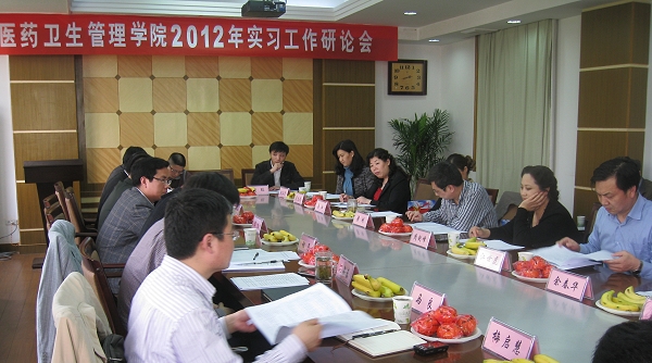 2012年4月19日,医管院召开本科毕业实习工作研讨会。湖北省卫生厅、武汉市卫生局、武汉医学科学研究所、陆军总医院、同济医院、协和医院、普爱医院、中心医院、儿童医院、武科大附属医院及本校医学图书馆等11家单位的实习负责人应邀参加了会议,与会人员还有医管院党政领导,教学督导组、系主任、教师代表及学生代表等。