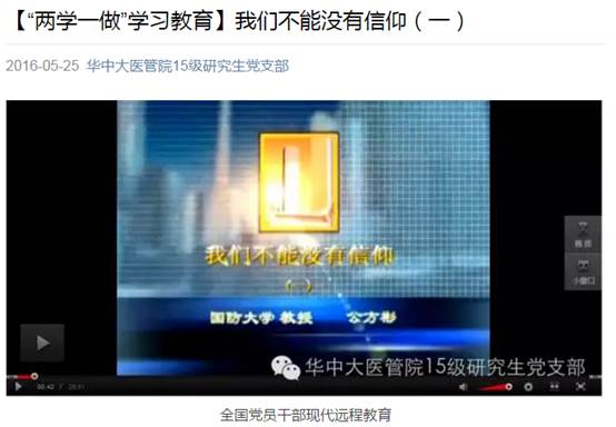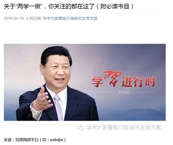 为积极响应党中央的学习号召,自3月8日开始,我支部创新形式开展关于“两学一做”保持党员先进性的学习活动,以支部微信公众号“华中大医管院15级研究生党支部”为平台,成体系分层次的进行主题教育。