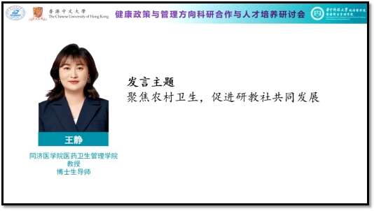 王静教授以“聚焦农村卫生,促进研教社共同发展”为题进行汇报,介绍我院卫生管理系的基本情况以及农村健康服务研究中心近年来的成果,并以慢性病医防融合服务管理为例介绍近年来农村及基层医疗服务所面临的机遇与挑战及潜在解决思路。