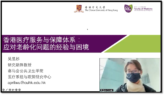 吴昱衫教授以“香港医疗服务与保障体系在应对老龄化问题的经验与困境”为主题进行汇报,其研究主要基于医疗大数据及电子信息病例对香港医疗服务体系进行系统评价,并强调基层医疗机构在整体老龄化应对问题中的贡献。