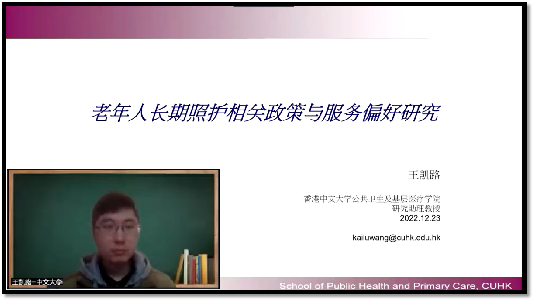 王凯路教授以“老年人长期照护相关政策及服务偏好研究”为题,介绍近年来在应对香港地区的老龄化问题所进行的老年人长期护理照顾、老年人慢性病管理以及健康偏好方法学探索。