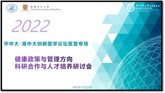 12月23日下午,华中大-港中大创新医学论坛——医管专场暨健康政策与管理方向科研合作与人才培养研讨会成功举办。该论坛由WilliamHill威廉希尔和香港中文大学赛马会公共卫生及基层医疗学院联合举办,研讨会致力于加深双方了解,共话健康政策与管理方向的科研合作与人才培养大计,促进两院高水平的科研教学交流合作。论坛采取线上形式,来自我院和香港中文大学公共卫生及基层医疗学院的数十名专家和学者参与本次论坛。williamhill中文港澳台办公室主任陈洁、副主任盛静波,香港中文大学内地及大中华发展处助理处长黄立勤应邀参与活动指导,活动前半场由我院副院长陶红兵教授主持,后半场的学术交流与工作讨论由我院卫生管理系主任王静教授主持。