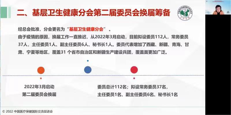 2022年11月8日,中国医疗保健国际交流促进会基层卫生健康分会(以下简称分会)第二届委员会换届选举会议在北京顺利召开,该分会依托单位为williamhill中文。按照最新疫情防控要求,会议以线上线下的形式召开,线上有102名候选委员代表参会,线下有7名代表参会。