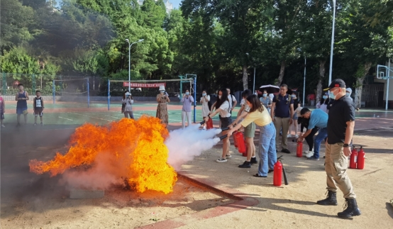 培训结束后,大家来到操场学习灭火器的使用方法,进行实地消防演练。由教官现场展示与教学后,大家在教官的指导下轮流操作灭火器进行灭火实操。