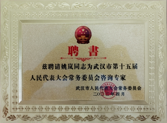 随后,吕友明介绍了武汉市人大常委会咨询专家库的建设情况。他说到,社会建设是“五位一体”总体布局的重要方面,党的十九届五中全会强调要“改善人民生活品质,提高社会建设水平”。为解决社会建设过程中遇到的实际问题,需聘请社会各界、各领域具有重要影响力的资深专家组成咨询专家库,通过专家们的研究与讨论为社会建设“献良计、献良策”,进一步提高社会建设水平。其中,医疗保障与医药卫生事业直接相关、相互影响,同时也与社会民生紧密相连。姚岚教授是我国医疗保障研究领域的知名专家,兹聘请姚岚教授为武汉市第十五届人大常委会咨询专家,为武汉市医疗卫生保障事业的长足发展提供专业咨询。
