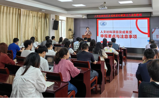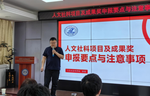 奖项申报方面,重点介绍了高等学校科学研究优秀成果奖(人文社会科学)和湖北省社会科学优秀成果奖,同时对校内科研激励政策进行说明,鼓励老师们积极申报,并强调成果申报要有学科意识,定位本成果的学科贡献,在申报材料撰写过程中不断提升成果的层次。