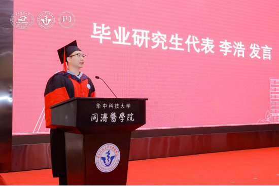 典礼第六项,毕业研究生代表李浩发言。李浩同学回忆了从硕士到博士的时光,讲述了母校与学院带给他的不仅是知识与技能,更是“进德修业,自强不息”、为人民谋健康的担当。感恩学院老师、感恩家人,并表示将把专业知识转化为惠民实绩,做一颗播撒健康理念的“种子”,把根扎进祖国大地。