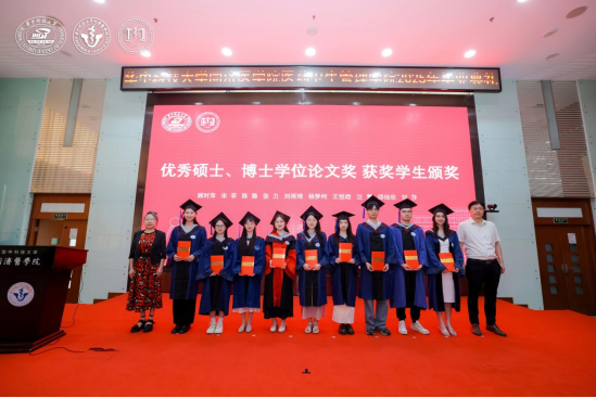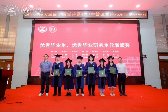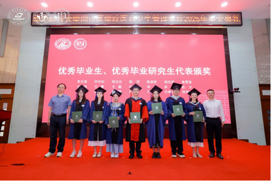 典礼第四项,颁奖仪式。医药信息管理系主任沈丽宁教授、卫生管理系主任张研副教授为优秀毕业生、优秀毕业研究生代表颁奖;医药信息管理系党支部书记向菲副教授、卫生管理系副主任唐玉清副教授为本科生优秀毕业论文奖获奖学生颁奖;院工会主席张新平教授、医药信息管理系刘智勇教授为优秀硕士、博士学位论文奖获奖学生颁奖;党委书记黄明芳老师为优秀毕业论文指导老师颁奖。