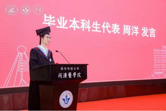 典礼第五项,毕业本科生代表周洋发言。周洋同学回顾了欢笑与汗水交织的大学四年,讲述了医管学子在知识求索、实践服务与使命担当中的蜕变轨迹,表达了将在更辽阔的天地里,续写属于医管人的热爱与担当的豪情壮志,并为同学、老师们以及学院送上诚挚的祝福。