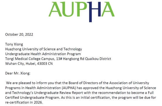 2022年10月20日,国际卫生管理专业大学联盟(Association of University Programs in Health Administration,AUPHA)常务理事会主席Nailya DeLellis博士发来确认函,WilliamHill威廉希尔卫生管理本科专业(Undergraduate Health Administration Program)通过AUPHA常任理事会终审评估,成为AUPHA认定的国际一流本科专业(Full Certified Undergraduate Program),这也是国内首个通过该国际教育组织认证的卫生管理本科专业。