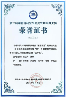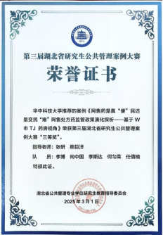 同时,张研、熊巨洋老师联合指导的2支团队分别以“医路泥泞”到康庄大道——多元医疗体系共筑坚实“医堡”》《网售药是真“便”民还是变民“难”网售处方药监管政策演化探析——基于W市TJ药房视角》为题,在第三届湖北省公共管理案例大赛中荣获三等奖。